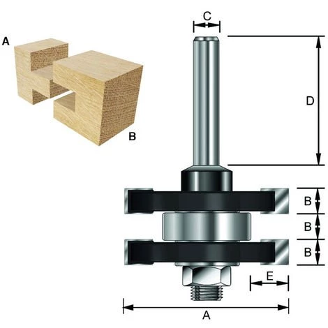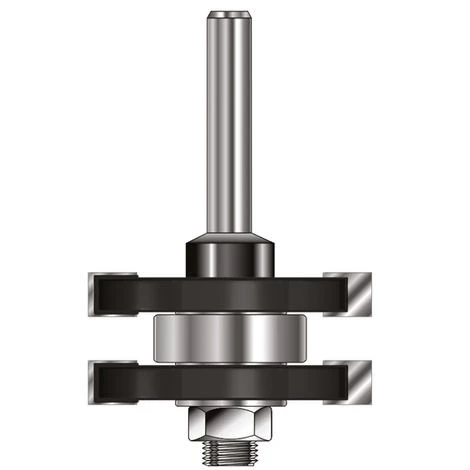 Zweischneidige Nut-und Federgarnitur für stabile Nut- und Federverbindungen mit Holzstärken bis zu 19 mm. Nutmesser und Kugellager können auf dem Aufnahmedorn in ihrer Anordnung verändert bzw. entfernt werden, um verschiedene Variationen zu fräsen.