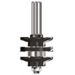 Profil- und Konterprofilgarnitur, HW, zweischneidig, mit auswechselbarem Kugellager. Set zum Fräsen von Profilen und Konterprofilen ohne Verstellen des Fräsers auf dem Aufnahmedorn. Lediglich Höhenjustierung notwendig. Profil 20° schräg. Für Holzstärken von 19-21 mm.