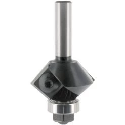 Fasefräser mit zwei achsparallel Hartmetall-Wendeplatten und austauschbarem Kugellager, flankenschneidend im 45° Winkel. Wendemesser 4-seitig verwendbar. Durch die mehrseitig verwendbaren Wendemesser besitzt das Werkzeug eine längere Standzeit im Vergleich zu festbestückten Fräsern. Die Wendemesser können mit einem TORX®-Schlüssel getauscht werden.