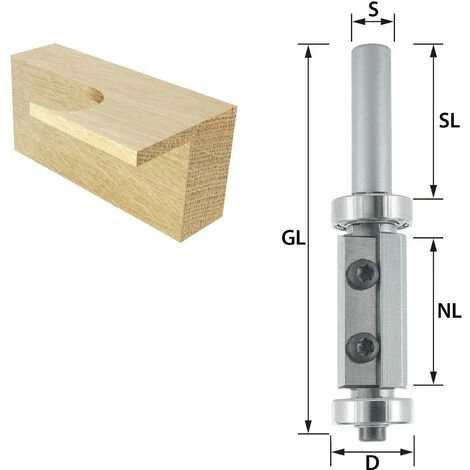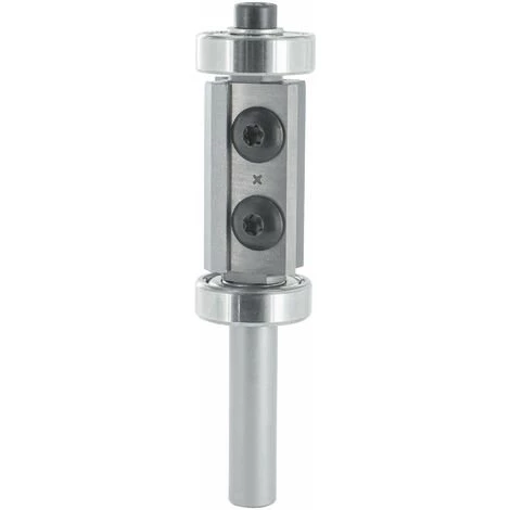 Flankenschneidender Bündigfräser mit zwei achsparallelen Wendemessern und zwei auswechselbaren Kugellagern. Durch die Kugellager an der Schaftseite und an der Stirnseite ergeben sich mehr Möglichkeiten beim Anfahren des Werkstücks, zudem können viele unterschiedliche Plattenstärken bearbeitet werden. Durch die mehrseitig verwendbaren Wendeplatten besitzt das Werkzeug eine längere Standzeit im Vergleich zu festbestückten Fräsern.