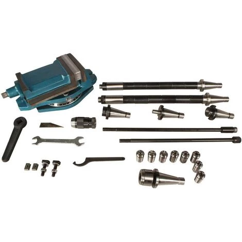 Lieferumfang: Schnellspannbohrfutter B18/1-16MM, 8 tlg. Spannzangenset (4,5,6,8,10,12,14,16mm), Maschinenschraubstock 160mm, Reduzierung MK3, MK2, Bohrfutterdorn ISO40-B18, Horizontalfräsdorn 22 u. 27mm, Kühlmitteleinrichtung, Halogenlampe, Ölpumpe, Schmiereinheit, pneumatische Anzugspindel
