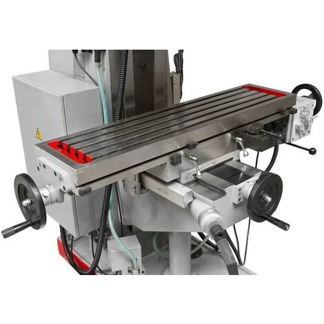 Lieferumfang: Kühlmitteleinrichtung, Vorschub X/Achse, 1xFräswelle 22mm, 1x Fräswelle 27mm, Spannzangenset 8tlg (4,5,6,8,10,14,12,16mm), Bohrfutter 1-16mm (B18), 1xMK2 – 1xMK3 – 1xB18 Aufnahme, Profi Schraubstock 160mm Backenbreite, Halogenlampe